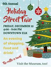 4:00 PM - 8:00 PM PSTFriday, December 12, 4 - 8 PM6th Annual Street Fair in downtown Elk